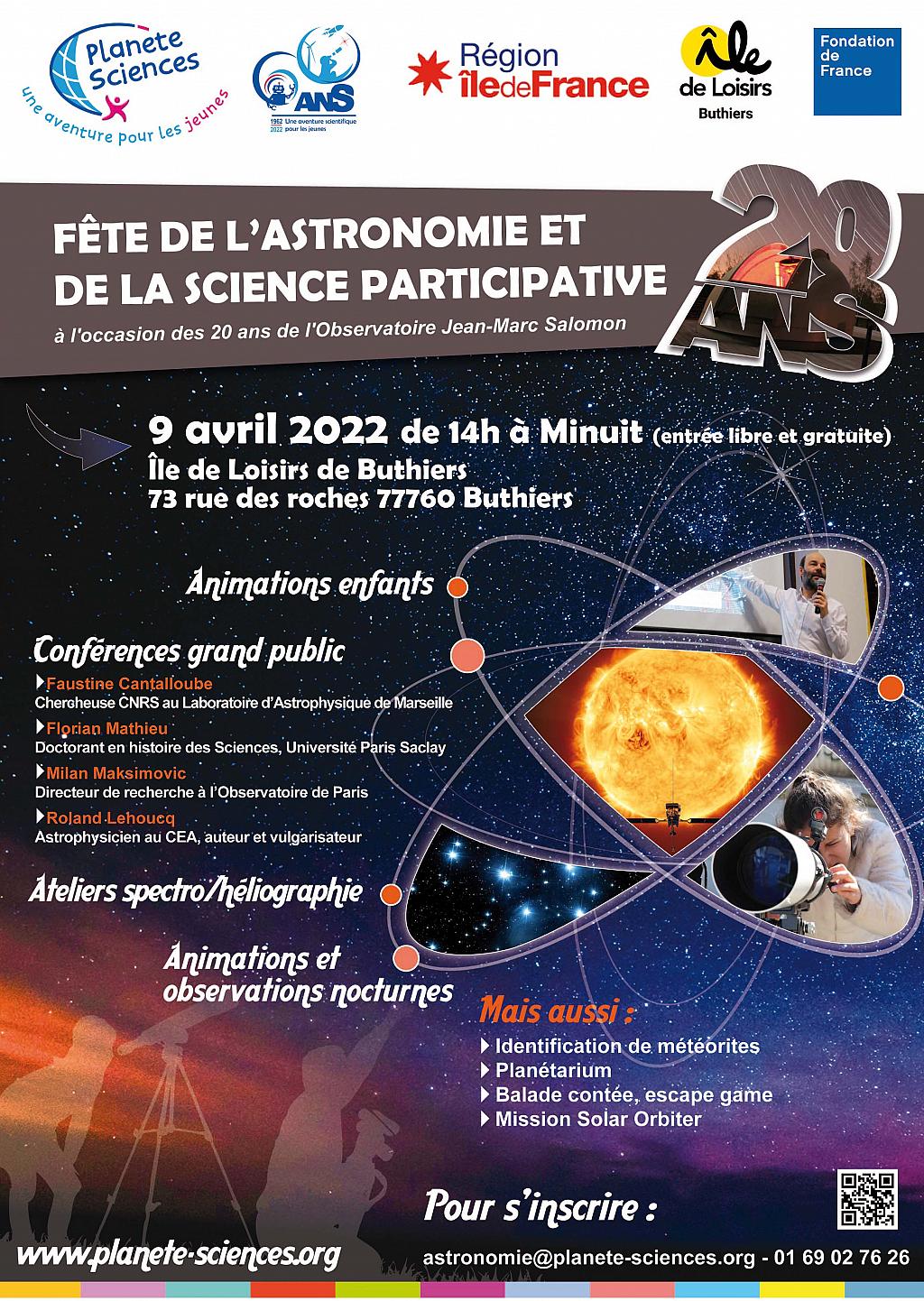 A l’occasion des 20 ans du Centre d’Astronomie Jean-Marc Salomon, Planète Sciences organise une Fête de l’Astronomie et de la Science Participative le samedi 9 avril 2022, de 14h à minuit. Tout au long de l’après-midi, vous serez accueillies par les intervenantes de l’association sur l’Île de loisirs de Buthiers. Une journée et une soirée pour fêter le ciel, la science, et les mystères de la nuit.