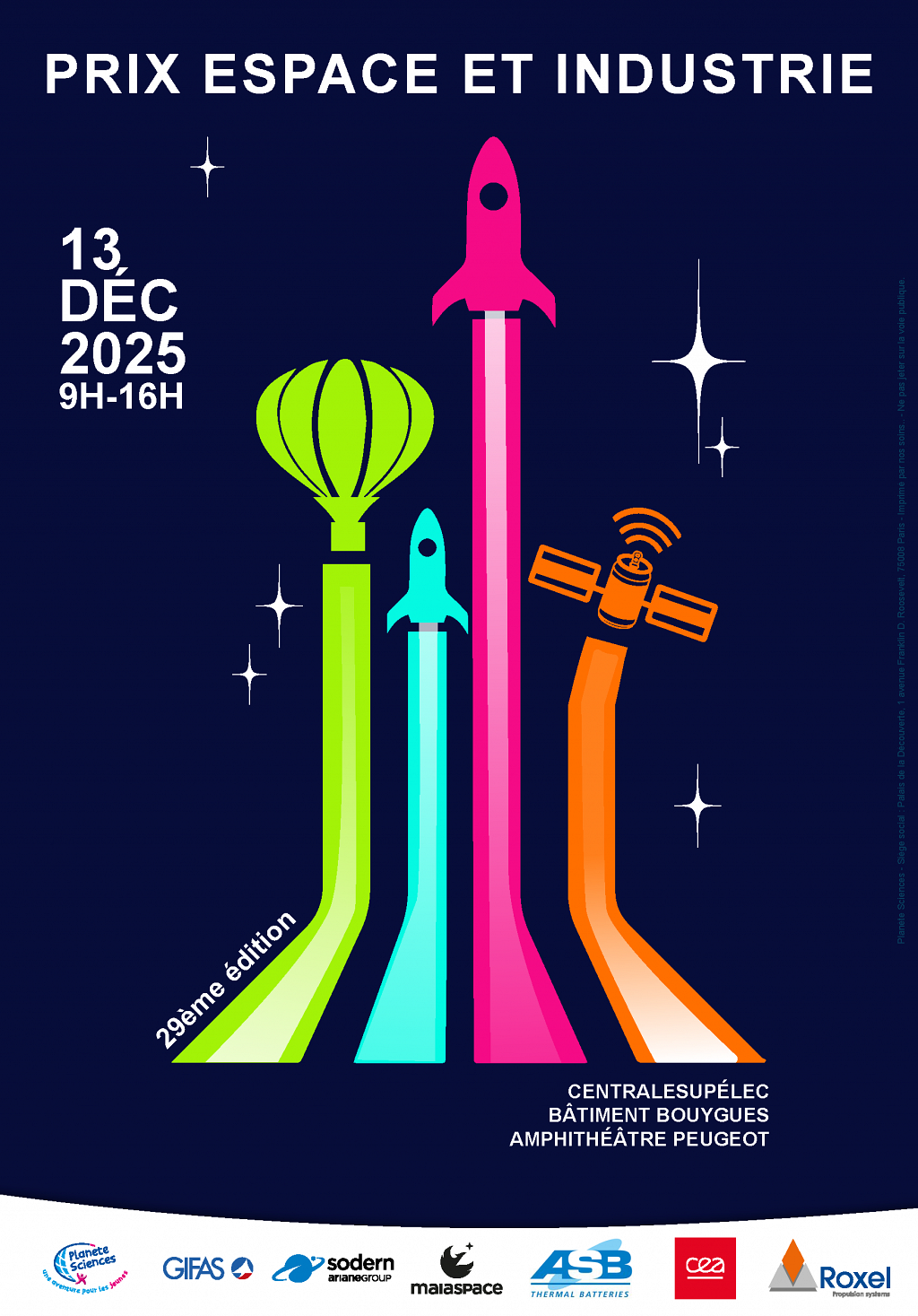 À l’issu des lancements de fusées et des largages CanSat lors des campagne C’Space 2024 et 2025, ainsi que des lâchers de ballon UBPE et BallonBUS entre 2024 et 2025, Planète Sciences et le GIFAS invitent les clubs et les établissements à la 29 ème édition des Prix Espace et Industrie le samedi 13 décembre 2025.