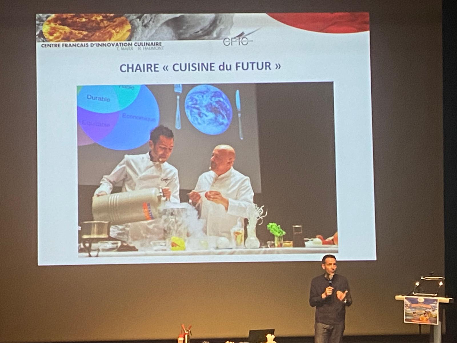 La conférence phare de la soirée a ensuite été animée par Raphaël Haumont, autour de la rencontre entre cuisine et science. Il a expliqué comment la chimie intervient dans la cuisson des aliments, à travers des exemples concrets comme la cuisson parfaite d’un œuf, son aspect visuel ou la position du jaune grâce à la science ! Il est également revenu sur les contraintes scientifiques liées à la préparation des plats de Thomas Pesquet lors de ses missions à bord de l’ISS. En effet, l’apesanteur nécessite de modifier la matière de certains aliments pour gérer par exemple les liquides, les miettes ainsi que l’équilibre nutritionnel du spationaute ! Car oui, il est hors de question que des gouttes d’eau ou des miettes de gâteaux se dispersent dans la Station ou que Thomas Pesquet ait des maux d’estomac !