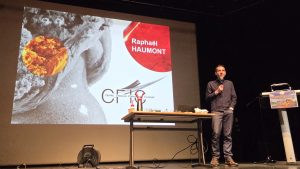La conférence phare de la soirée a ensuite été animée par Raphaël Haumont, autour de la rencontre entre cuisine et science. Il a expliqué comment la chimie intervient dans la cuisson des aliments, à travers des exemples concrets comme la cuisson parfaite d’un œuf, son aspect visuel ou la position du jaune grâce à la science ! Il est également revenu sur les contraintes scientifiques liées à la préparation des plats de Thomas Pesquet lors de ses missions à bord de l’ISS. En effet, l’apesanteur nécessite de modifier la matière de certains aliments pour gérer par exemple les liquides, les miettes ainsi que l’équilibre nutritionnel du spationaute ! Car oui, il est hors de question que des gouttes d’eau ou des miettes de gâteaux se dispersent dans la Station ou que Thomas Pesquet ait des maux d’estomac !