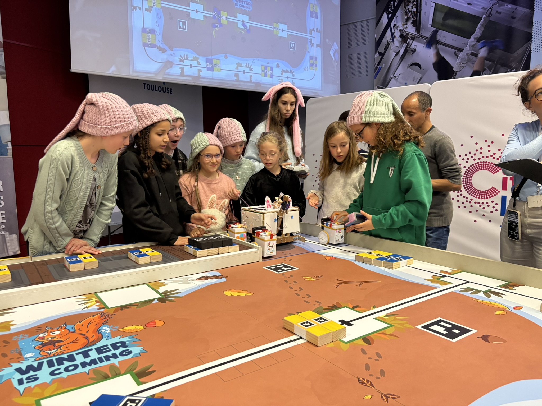 Le samedi 28 mars, dans le cadre de la Cité de l’espace à Toulouse (31), Planète Sciences Occitanie a organisé la coupe régionale de robotique dont l’objectif est de sélectionner les équipes qui participeront à la Coupe de France de Robotique Junior qui se déroulera du 13 au 16 mai à La Roche-sur-Yon. Quelques 1500 visiteurs ont assisté aux épreuves des 13 équipes de jeunes de 7 à 18 ans présentes. Lors de cette 33ème édition, l’objectif des jeunes compétiteurs était d’incarner un écureuil et de récolter un maximum de noisettes avant l’hiver sans les faire tomber et sans bousculer le robot adverse ! Les meilleures équipes se sont qualifiées pour la finale française de la Coupe de France de Robotique. À la fois ludiques et motivants, ces défis permettent d’aborder de nombreuses disciplines scientifiques telles que l’électricité, la mécanique, l’électronique, la programmation… tout en apprenant à s’organiser et travailler en équipe. En plein cœur de la Cité de l’espace de Toulouse, la Coupe a créé des ponts entre la recherche, le monde étudiant, les entreprises et l’éducation populaire, tout en offrant au grand public une opportunité d’exploration des sciences et techniques. Cerise sur le gâteau, les visiteurs ont eu la chance d’assister à une table ronde passionnante sur la place des femmes dans l’IA.