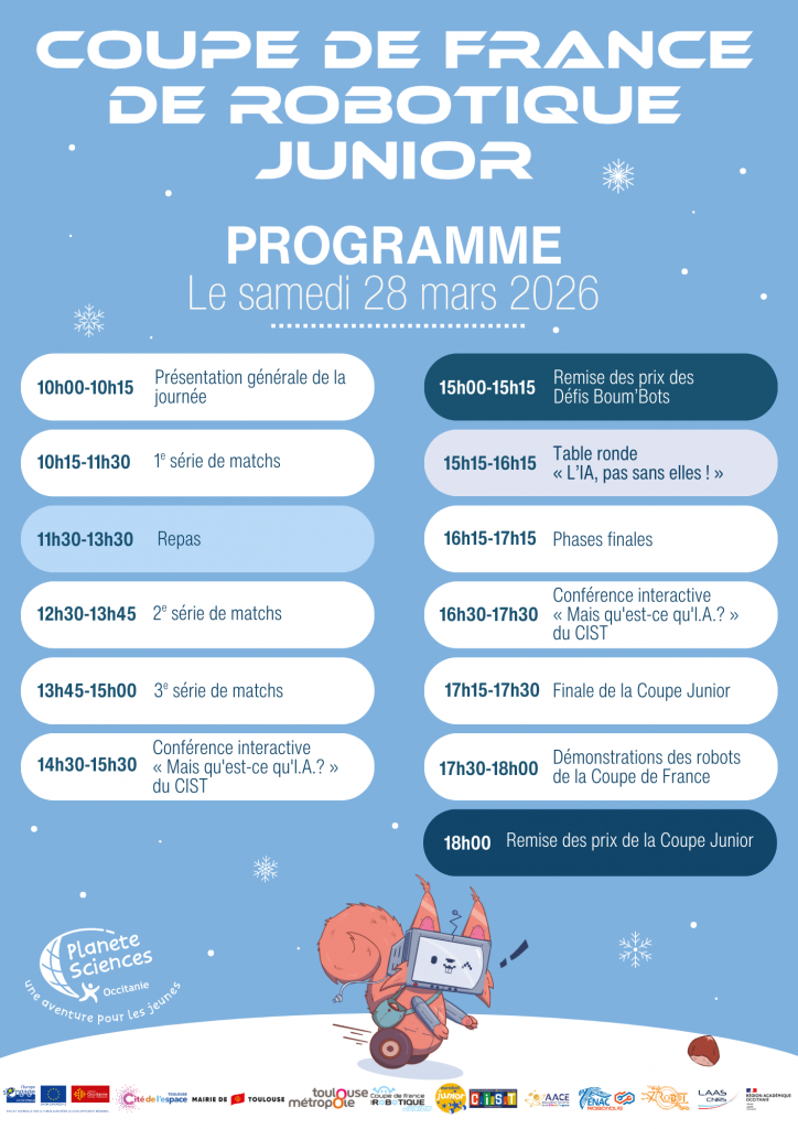 Samedi 28 mars 2026, de 9h30 à 18h, aura lieu La Coupe de France de Robotique Junior, un concours régional de Planète Sciences Occitanie, organisé à la Cité de l’espace, à Toulouse ! Après 8 mois de préparation, 13 équipes de jeunes de 8 à 18 ans s’affronteront pour offrir un show unique et guider le robot qu’ils ont fabriqué sur le chemin de la victoire. L’objectif de cette 33ème édition est d’incarner un écureuil et de récolter un maximum de noisettes avant l’hiver sans les faire tomber et sans bousculer le robot adverse ! Les équipes les plus performantes et stratégiques seront qualifiées pour la finale française de la Coupe de France de Robotique, qui se tiendra du 13 au 16 mai à La Roche-Sur-Yon, aux côtés de participants venant de toute l’Europe.
