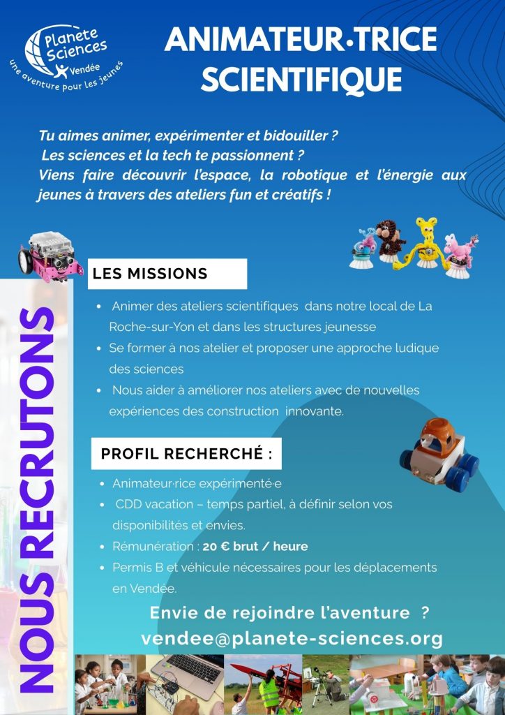 Nous recherchons un·e animateur·rice en vacations ponctuelles pour faire découvrir l’espace, la robotique et l’énergie aux jeunes à travers des ateliers ludiques et créatifs.